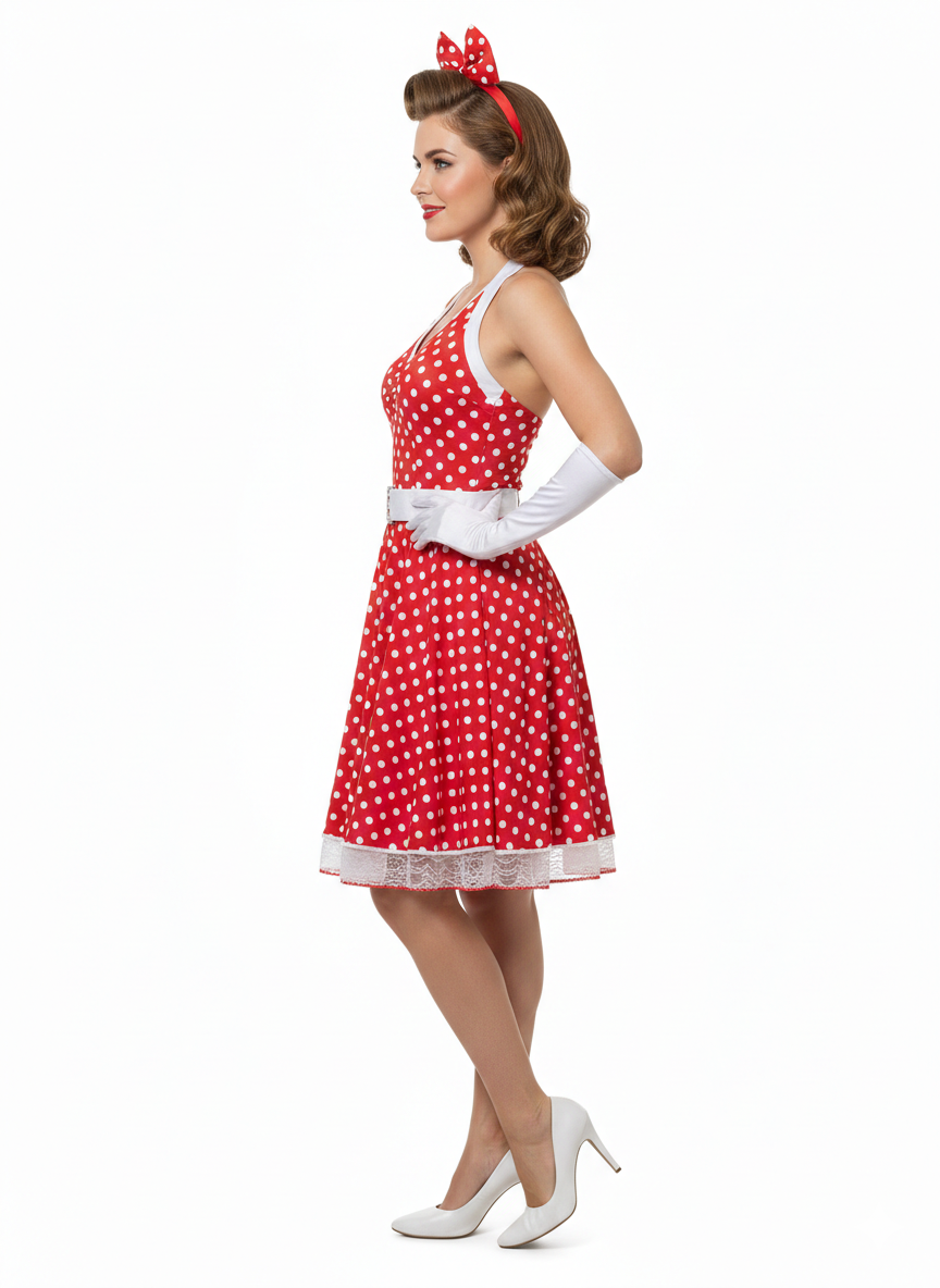 ❤️⚪ Fantasia Vestido Vermelhor Anos 60 – charme, cor e atitude vintage!Essa fantasia é uma explosão de estilo inspirado nos anos 60, com referências claras ao visual pin-up: feminino, divertido e cheio de personalidade. Ideal para quem quer brilhar com um look nostálgico e alegre! 👗 Detalhes encantadores: 🔴 Vestido vermelho com estampa de bolinhas brancas (poá), clássico do estilo retrô. 🤍 Cintura marcada com cinto branco, valorizando a silhueta. 👓 Óculos com armação branca e colar de contas, acessórios típicos da época. 🎀 Faixa vermelha com laço na cabeça, toque final de doçura e irreverência. 🎉 Perfeita para: Festas retrô, bailes temáticos ou eventos de moda vintage. Cosplay inspirado em ícones como Betty Boop ou Marilyn Monroe. Sessões fotográficas com estética pin-up ou rockabilly.